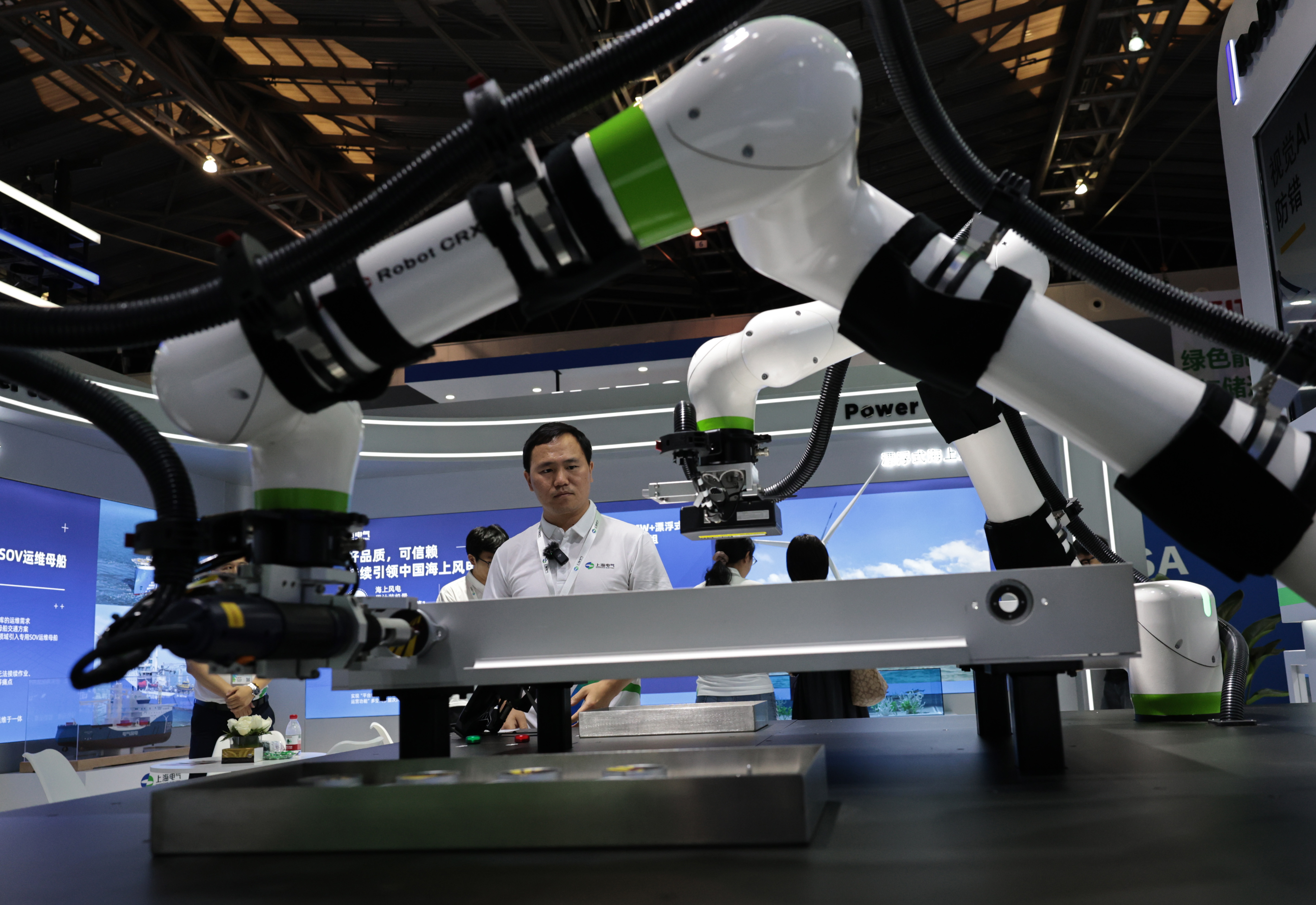2025年6月11日,在上海举行的第十一届中国(上海)国际技术进出口交易会上,工作人员观看进行作业演示的电池包装配及插线检测协作机器人。新华社记者 方喆 摄